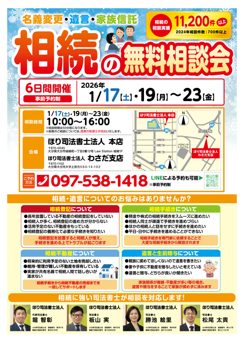 1月17日(土)、19日(月)~23日(金)で相続の無料相談会を実施します!